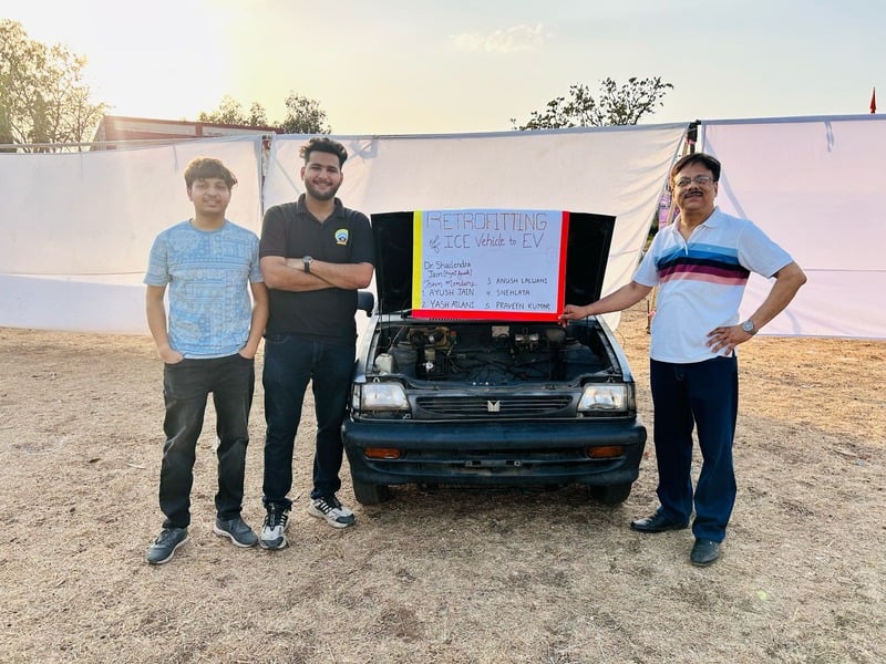 An electric Maruti 800 with a custom battery and ESP32 telemetry. Features include GPS, regenerative braking, solar charging, mobile app integration, a 60 km/h top speed, and 80ā100 km range.