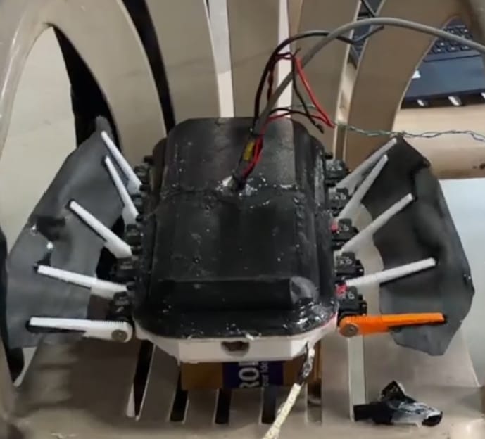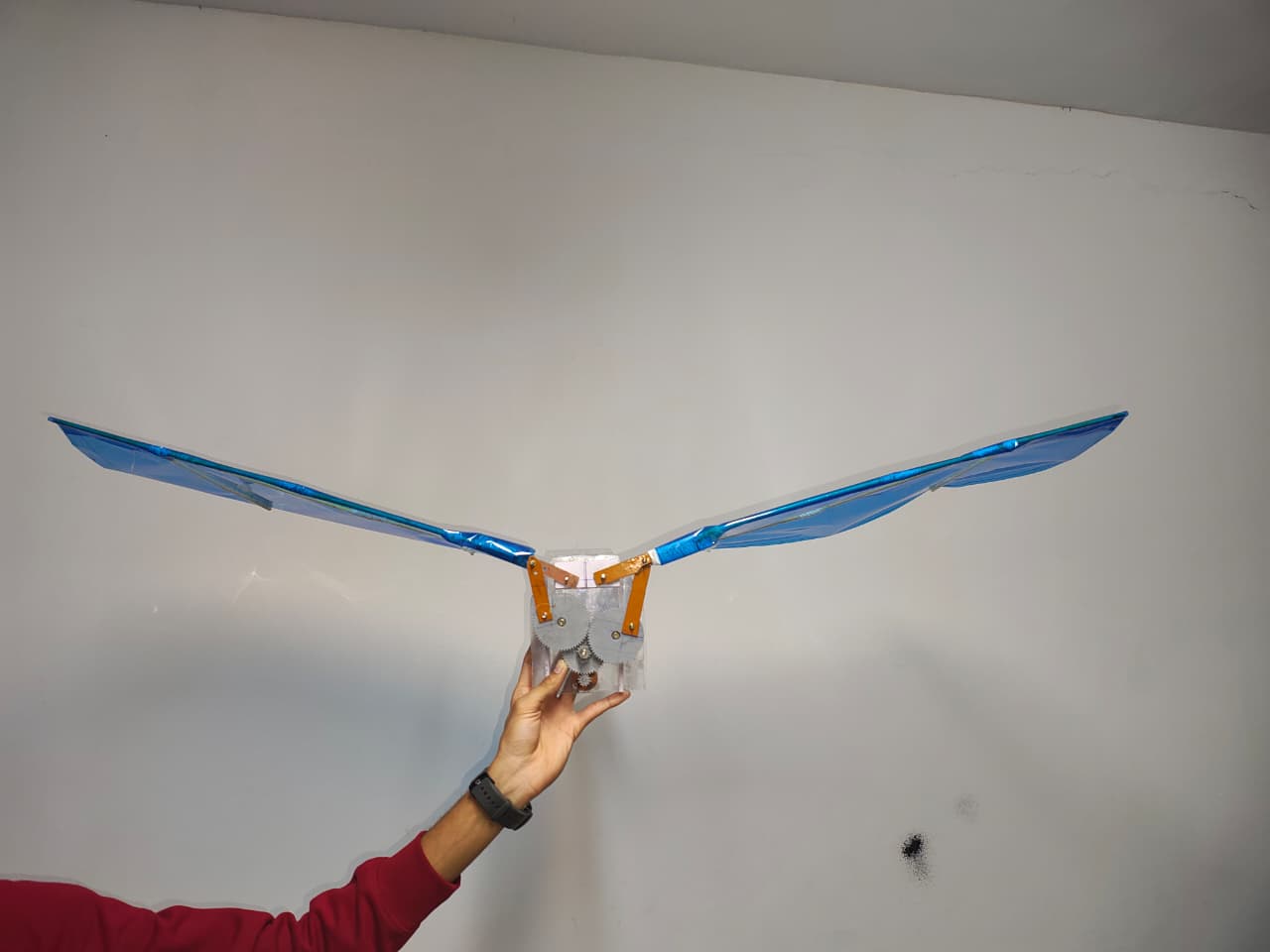 A bio-inspired ornithopter featuring coordinated flapping wings, designed to achieve efficient aerodynamic performance, precise servo-based control, and optimized mechanical transmission for low-noise aerial operation.