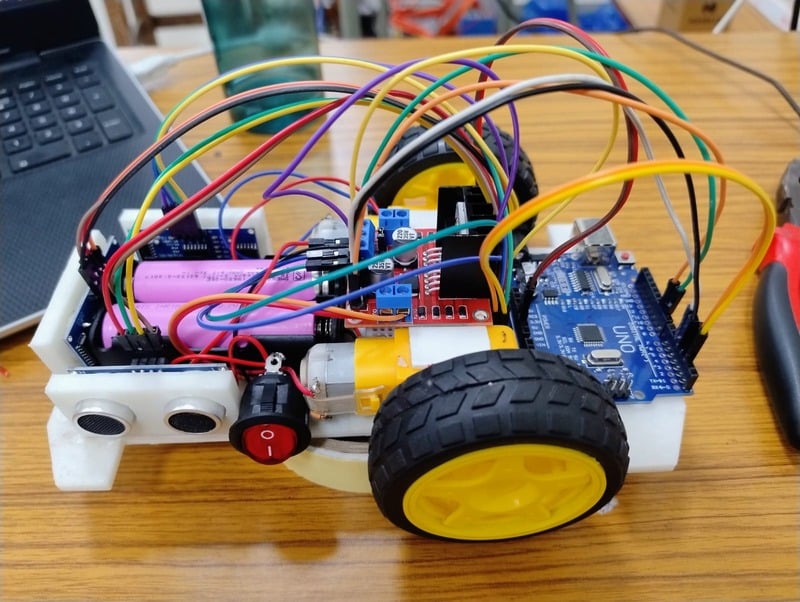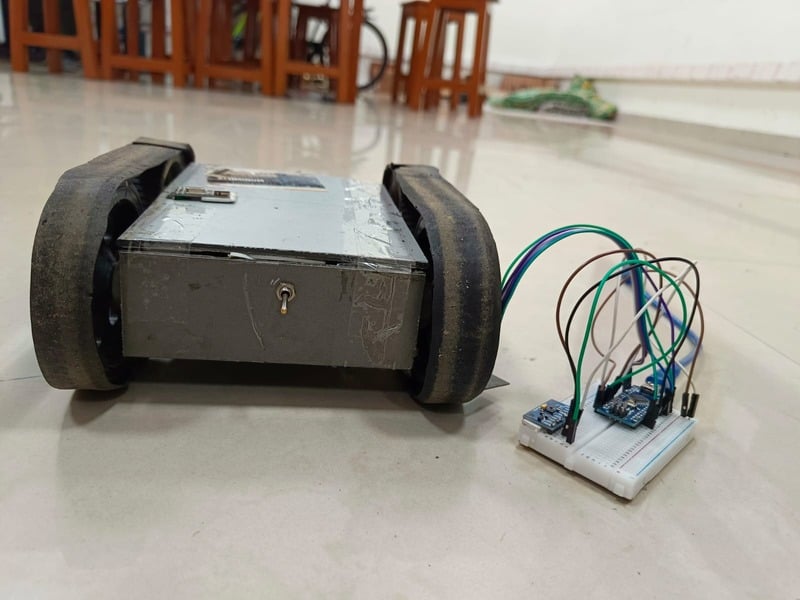 A remote-controlled car using Arduino Uno. It receives commands from a hand gesture remote via an NRF Module, controlling movement for a compact, low-cost robotics project.